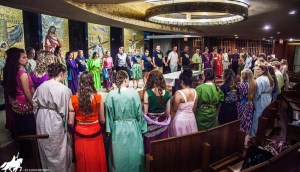 PRE-SHOW RITUAL–The cast and creative team of ‘Just Pretend’ gather for a final boost of confidence before the show commences. At Youth Sing Praise, the show acts as a capstone to the week of prayer and preparation.