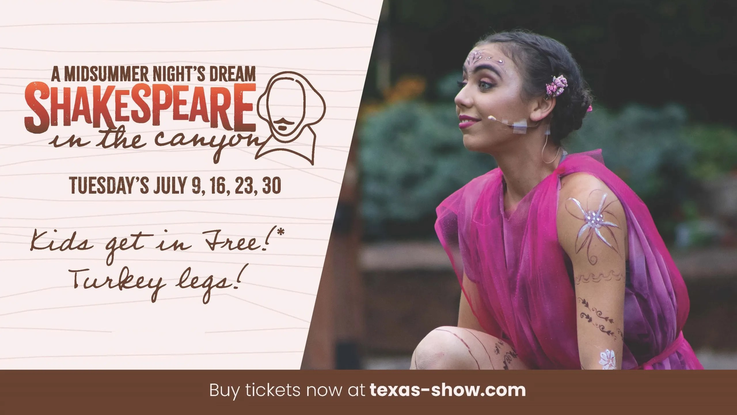 Welcome Wanderers performs at 7:20pm on July 9, 16, 23, and 30. Procure tickets to A Midsummer Night’s Dream at 8pm on Tuesdays in July on texas-show.com!